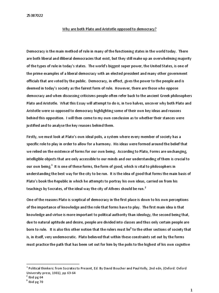 The assigned quotation comes from Plato’s Allegory of the Cave. It is a famous passage from the beginning of Book 7 called The Republic. Plato was born and lived in Athens, Greece around the time period of BC. Plato was a very well-educated and influential philosopher. He was a student of Socrates and a [ ] 21/12/ · Plato’s The Republic presents a critical view of democracy through the narration of Socrates: “Democracy, which is a charming form of government, full of variety and disorder, and dispensing a sort of equality to equals and unequaled alike.”. In his work, Plato lists 5 forms of government from best to blogger.comted Reading Time: 8 mins Essays on Plato. Please enter something. Comparison of Philosophy of Aristotle and Plato. Words • Pages • 4. Throughout life, one will encounter many different people some with similar views and others with contrasting perspectives on reality. This topic and discussion on life and reality continues to rise debate since ancient times